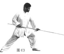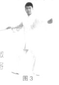 (1)两手同时向身体外侧划弧,身体下沉,两腿微屈,右手握棍,用腋下夹住棍,将棍的梢端向下向右截出。(图3)