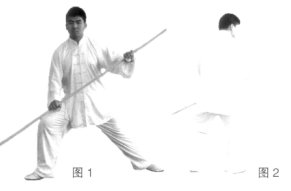 将棍由上向下迅猛劈出,力达棍身前端。(图1、2)