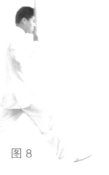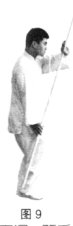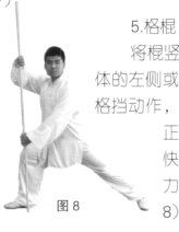 将棍竖放于身体的左侧或右侧做格挡动作,身体中正,动作快速有力。(见图8)