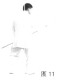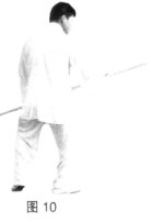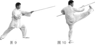 两手持棍,将棍的梢端迅速由下向上挑出,力达棍的前端。(图9、10)