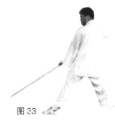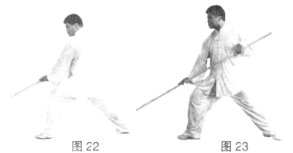 (1)左胯松沉,身体左转,左脚向左垫步,右脚向前上步成右弓步。同时两手握棍迅速换把,将棍的把端由右向左前扫棍。目视棍的把端。(图21)