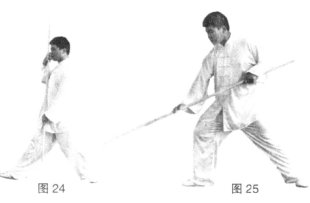 (3)上动不停,左胯松沉,身体左转,右脚向前上步成右弓步。同时两手握棍迅速换把,将棍的把端由右向左前扫棍。目视棍的把端。(图23)