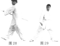 (1)右胯松沉,身体微右转,左脚后撤步成左弓步。同时两手握’棍先向身体右侧舞花棍,然后再向身体左侧做舞花棍。(图28、29)