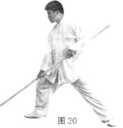 (2)上动不停,重心移至右腿成右弓步,两手握棍迅速换把,将棍的把端由上向下向右侧打出去。目视棍的把端。(图30)