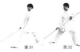 (1)右胯松沉,右脚向后撤步成右弓步。同时两手握棍迅速换把,右手持棍向后抽拉棍放于身体右侧;左手持棍将棍的梢端由上到下向左前压棍打出。目视棍的梢端。(图31)
