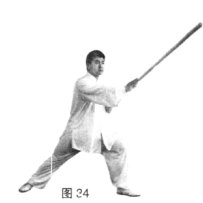 (1)左胯松沉,右脚蹬地,身体左转,左脚向后撤步成左弓步。同时两手握棍迅速换把,用棍的把端向左上横打出去。(图34)