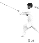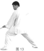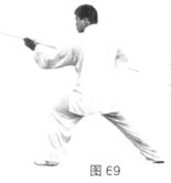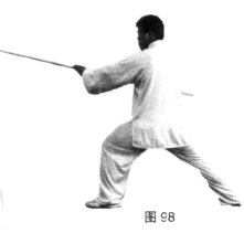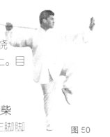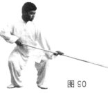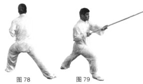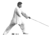 (1)左胯松沉,身体左转,重心移至左腿。同时两手握棍将棍的梢端向下向左划弧,目视左前方。(图48)