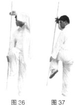 (1)身体微左转,右脚上提重心移至左腿,成左独立步。同时两手握棍迅速换把,把端向下,立棍放于右腿外侧。目视棍的把端。(图36)