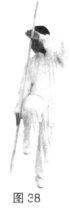 (3)上动不停,身体左转,左脚向后落步,右脚上提重心移至左腿,成左独立步。同时两手握棍迅速换把,把端向下,立棍放于右腿外侧。目视棍的徊湍。(图38、)