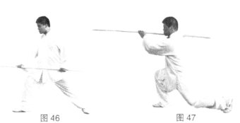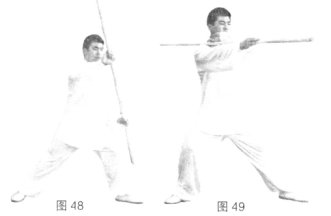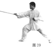 右脚向右落步成右弓步。同时左手向上拉棍的梢端;右手向下压棍的把端,双手持棍将棍的把端向前刺出。目视棍的把端。(图39)