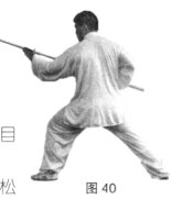 (1)右胯松沉身体右转,左脚向前上步成左弓步。同时两手握棍迅速换把,将棍的梢端向上挑出,与肩相平。目视棍的梢端。(图40)