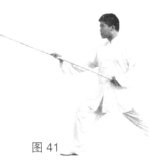 (2)上动不停,右胯松沉,右腿向后扫1 800,成右弓步,同时两手迅速换把,将棍的把端向右侧刺出。目视棍的把端。(图41)