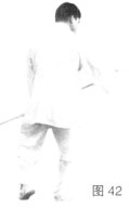 左胯松沉,身体左转,左脚脚尖外摆,右脚迅速向左前上步左脚跟步,成右实左虚步。同时双手握棍迅速换把,左手持棍放于左胯处随势而功,右手持棍将棍的把端由上到下向右侧盖打。目视右前方。(图42)