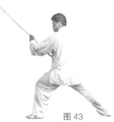 (1)左胯松沉,身体左转,左脚向左上步成左弓步。同时两手握棍迅速换把,左手搭于棍身,右手持棍将棍的梢端向上挑出。目视棍的梢端。(图43)