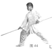 (2)上动不停,左胯松沉,右脚经左腿向前上步成右弓步。同时两手握棍迅速换把,左手持棍放于左胯处随势而动,右手持棍将棍的把端由上到下向左盖打。目视棍的把端。(图44)