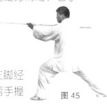(3)上动不停,右胯松沉,左脚经右腿向前上步成左弓步。同时两手握棍迅速换把,将棍的梢端由下向上划立圆挑棍,把端放于右大臂上,大臂与肩持平。目视棍的梢端。(图45)