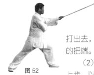 (2)上动不停,重心移至左腿成左弓步,同时双手持棍,利用两手握棍翻转的力量将棍的梢端由后向左前打出。目视棍的梢端。(图54)