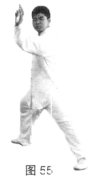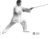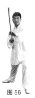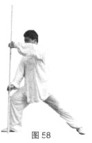(2)上动不停,左胯松沉,重心再移至左腿成左弓步。同时两手托棍向后向下,利用两胯转换虚实的力量将棍的梢端向前刺出。目视正前方。(图56)