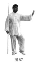 身体上起微左转,右脚上步,左脚虚步点地。同时两手持棍迅速换把,由右后向前划立圆,将棍的把端向前挑出;上动不停,右手持棍夹于右腋下,左手变掌向前推出,与肩相平。目视左前方。(图57)