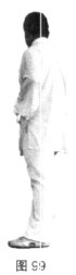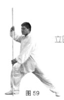 步形不变,两手握棍翻转划立圆,将棍的把端向上、梢端向下,然后两手握立于身体右侧,梢端朝下。目视右前方。(图59)