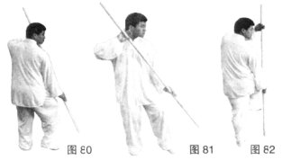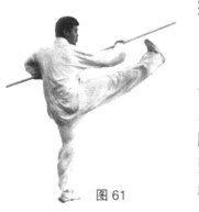 左胯松沉,身体左转,右腿屈膝上提,成左独立步。右脚迅速向前蹬出,力达脚跟,同时两手持棍迅速换把,将把端向左前横打出去。目视棍的把端。(图61)