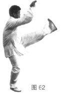 右脚落地,左腿屈膝上提向前蹬出,同时双手握棍架过头顶。目视正前方。(图62)