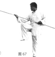 接上式拨棍以后,两手握棍由左向右向下向左搅棍,同时右腿屈膝上提,重心移至左腿成左独立步,双手握棍放于体前。目视右前方。(图67)