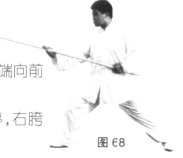 (1)右脚震脚落地成右弓步。同时两手迅速换把,将棍的把端向前刺出。(图68)