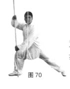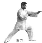 (1)左胯松沉,身体微左转,重心移至左腿成左弓步。同时两手持棍迅速换把,将棍的梢端向左刺棍。目视左前方。(图71)