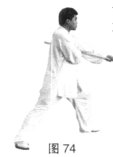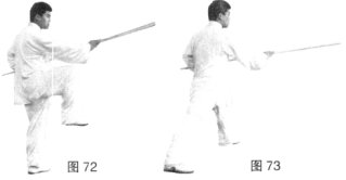 (3)上动不停,右脚落步,然后左脚向前落地成左弓步。身体左转,同时两手持棍将棍的把端从身体右侧向左前方横打出去。目视左前方。(图73)