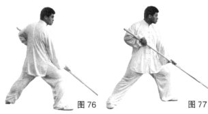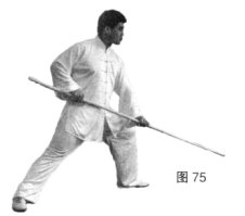 (2)上动不停,右胯松沉,身体右转,重心后移至右腿,然后再移至左腿成左弓步。同时两手持棍在身体右侧划立圆,将棍的梢端向上向左前压棍打出。目视左下方。(图75)