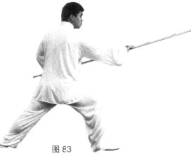右脚向斜前方上步成右弓步。同时两手握棍迅速换把,将棍的把端向左前方挑出。目视棍的把端。(图99)