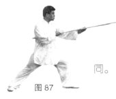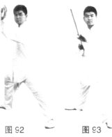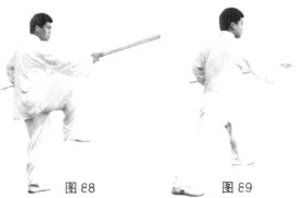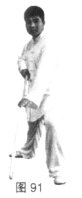 身体微右转,左脚向左前上步成左弓步。同时两手握棍将棍的梢端由左后向右前盖打。目视前方。(图91)