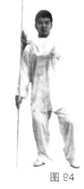 右脚向前上步,左脚虚步点地成左虚步。同时将棍的把端向前打出,然后将棍的把端向上向后向下划弧立于身体右侧,把端朝下,左手搭于棍的梢端。目视正前方。(图94)