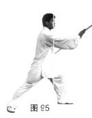 左胯松沉,身体微左转,左脚向左前上步成左弓步。同时两手握棍将棍的把端由右下向上向左前打出。目视左前方。(图95)