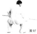 右脚经左脚向左前上步,左脚跟步成右实左虚步。同时两手握棍迅速换把,将棍的把端向上向左画圆打出。目视右前方。(图97)