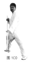 右脚向前上步,用棍的把端向前打出,将棍的把端向上向后向下划弧立于身体右侧,把端朝下,呈起势姿态。(图103)