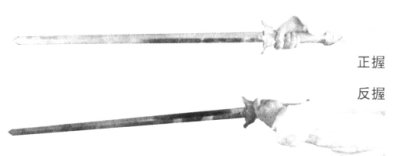 右手握剑,虎口贴近剑格,四指弯曲握住剑柄,拇指放在食指的第二关节。握剑时手腕灵活,一般就是用食指拇指扣紧剑柄,其余三指辅助,这样便于剑法的使用。有正握剑、反握剑。如图示