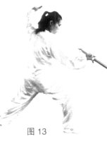 平剑,剑尖由左向右划一小立圆为绞,力达剑身前端。(图13、14)