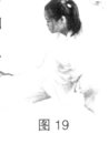 (1)右脚跟步成右虚步,同时右手握剑掌心朝上向右前刺出,左手剑指向下搭于右手腕处。(图19)