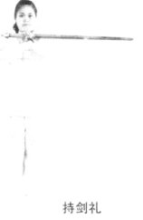 并步站立,左手持剑,屈臂抬起,使剑身贴前臂外侧横于胸前,右手成掌,掌外沿附于左手食指根节,高于胸齐,两眼平视前方。如图示。