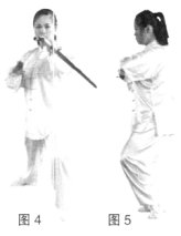 立剑,剑刃由下向前上方为撩,力达剑身前端,分正撩剑和反撩剑。(图3、4、5)