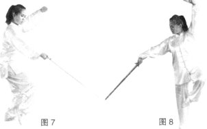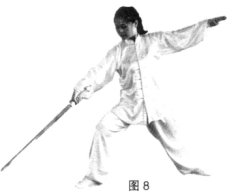 立剑,手臂内旋,使剑尖由前向下、向后或向上、向后为挂,力达剑身前端,分左挂剑和右挂剑。(图6、7、8)