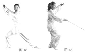 (3)上动不停,左胯松沉,身体左转,右脚向左上步,左脚跟步成左虚步,同时右手握剑掌心朝上向左刺出,左手剑指向上划弧架于头顶。(图13)