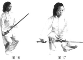 (1)左脚跟步成左虚步,同时右手握剑绞剑,左手剑指向下划弧放于右手腕处,向身体右侧下压。(图16、17)