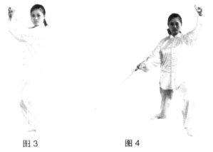 注意:右手握剑注意和下肢动作的协调配合做到手到脚到。