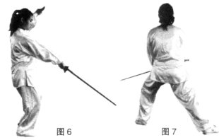 注意:上步要轻要快,注意身体各部位与剑的协调配合。