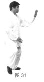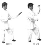 左脚落地,左胯松沉身体左转,右脚脚尖左摆成右实左虚步;同时左掌变拳呈立拳屈肘上领,右手从身体右侧向前划弧变拳放于左肘肘尖下,拳眼朝上。(图29、30)