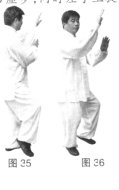 (2)上动不停,右胯松沉,身体微右转,右脚向右上步,左脚跟步成右实左虚步;同时两手向右向前划弧,右手在前左手在后放于胸前。(图36)