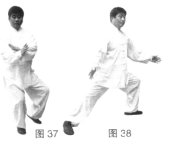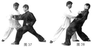 (3)乙在被甲引进欲退时,甲松肩沉肘变按掌,顺势重心前移,双手向前按击乙胸部。(图37、38)